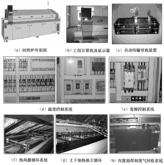 回流爐內(nèi)部結構主要包括有加熱系統(tǒng)、傳動系統(tǒng)、冷卻系統(tǒng)和控制系統(tǒng)等。外部機構有電源開關、信號指示燈、設備操作接口、緊急開關、抽風散熱系統(tǒng)和傳輸系統(tǒng)等。