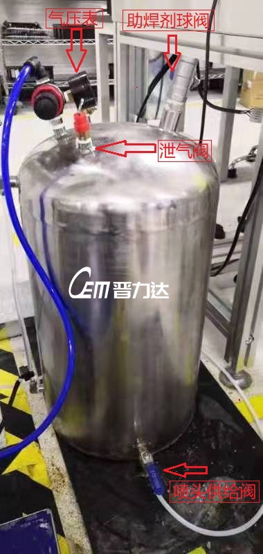 壓力罐也采用316不銹鋼制作,整體采用焊接密封,通過球閥注入助焊劑,關閉閥門,加注經(jīng)過干燥后的空氣壓力,通過氣壓擠出助焊劑至噴嘴處,能保證供液的穩(wěn)定和均勻性,對助焊劑穿透到焊盤內(nèi)有很大幫助,對后續(xù)波峰焊接上錫透錫至PCB板面很關鍵,助焊劑沒有穿透元件腳至焊盤孔內(nèi),錫就無法爬升至PCB表面。缺點是造價較高,維護較為困難,工程師需要一定的操作基礎。