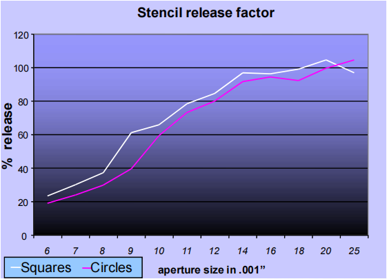 測試數(shù)據(jù)表明,對于小孔徑,方形孔表現(xiàn)要比圓形孔要好,如下圖所示(結(jié)果來自于一個0.005”的電鑄鋼網(wǎng))