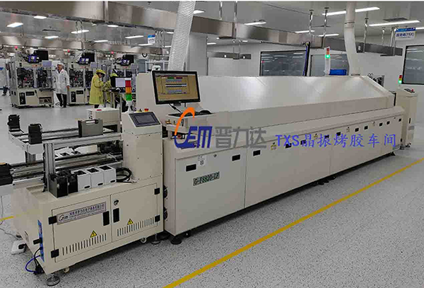 下圖為惠倫晶體重慶分公司TXS晶振烤膠事業(yè)部自動上下料機+固化雙軌回流(拍攝照片經由客戶同意)